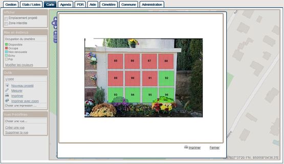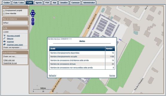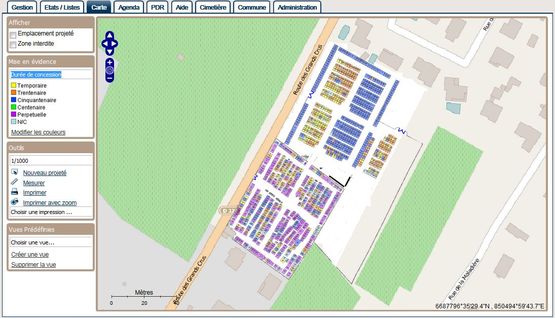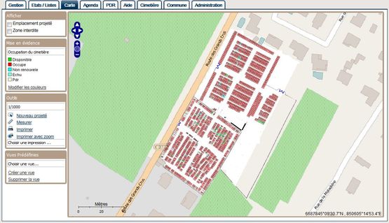 - Gestion de la cartographie : consultation directe des informations d’une concession sur le plan, ajout/suppression d’emplacements, repères visuels graphiques en fonction du thème (occupation, durée des concessions, …)